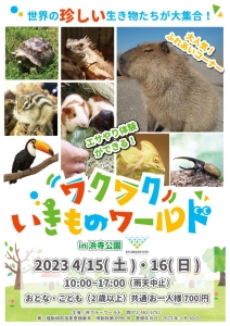 イグアナ・リクガメ等の爬虫類や、ウサギ・モルモット等の小動物、その他コールダック等展示生体が大幅に増え、餌やり等の体験も充実いたしました。館内の一部は引き続き昆虫展として世界のカブトムシやクワガタを展示し、昆虫ふれあいコーナーもございます。ぜひ一度足をお運びいただきますようお願いいたします。